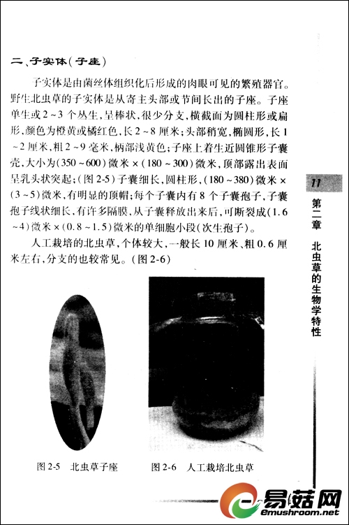 上面叙述的虫草一般是指寄生于虫体或蛹体的冬虫夏草和北虫草,两者具有相似的医疗保健功能。据《新华本草纲要》记载:“北虫草味甘,性平,益肝肾,补脊髓,止血化痰”。卫生部出版的《全国中草药汇编》中也有“北虫草的子实体及虫体可作为冬虫夏草入药”的注解。而人工栽培的非寄生于虫体的北虫草(图1-5、1-6)同样是具有较高滋补和药用价值的珍贵中药。据多方面报导:人工栽培的北虫草有保肺益肾、止血化痰、调节身体机能、增强免疫力及美容护肤、抗衰老等作用,对神经系统、内分泌系统、心血管系统有良好的调节和补益作用,特别是在抗肿瘤、化疗和戒毒方面有其他物质所不能代替的珍贵价值,对儿童支气管哮喘也有一定的疗效。