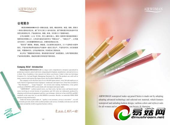 浙江庆元欧迪实业有限公司位黄田镇工业区1号,是浙江省建厂最早的一家铅笔生产企业,设备最先进、最齐全、规模最大、技术力量雄厚。集化妆品、铅笔、橡皮的研发、制造、销售服务为一体,年产铅笔3亿多支、眉笔5000万支,实现销售6016万元,上交税款350万元,拥有自营出口权。“欧迪”、“爱沃玛”牌等化妆系列采用世界先进的生产设备和一流的工艺生产。产品远销欧美等几十个国家和地区, 深受广大消费者的喜爱与青睐。