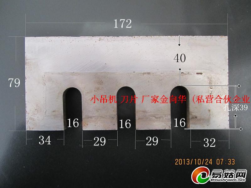例6:170长*80*8的刀片的数据:量出刀长172,量出刀宽79毫米,3个槽、槽宽为16mm,中间的铁29、左边的铁这34,右边的铁这32,槽深39,刀片总长度为 铁34+槽16+铁29+槽16+铁29+槽16+铁32=172mm,为此槽的中心距为:一个槽宽16+中间的铁宽29=45毫米 即二个槽中心之间的距离为45。