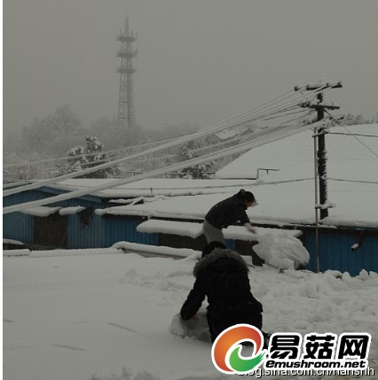 连续的雪天给生产蘑菇的大棚带来了很大威胁。至上午12:00时,积雪厚度大约有17、8公分。其实,雪地的厚度还不是主要的威胁生产大棚的因素,雪中的水分才是威胁的主要因素。在北方,雪是干燥的,人多在寒冷中是清爽、清醒的。而在南方,这几天的寒冷感觉是透骨的,稍稍一点风,冰冷贴着脖项、袖口往里钻。