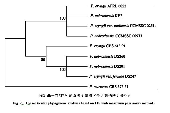 经过MEGA 4.0比对和人工调整,最后得到615个同源位点,邻近法和最大简约法构建的系统发育树结构一致。以最大简约法生成的树为例,作为外群的糙皮侧耳与其他8个菌株完全分开。而来自新疆的4个菌株聚在同一组,来自意大利的P. nebrodensis、P. eryngii var. ferulae与来自CBS的P. eryngii聚为另一组,两组的节点支持率分别达到100%和96%。在组内意大利的P. nebrodensis和P. eryngii var. ferulae聚为一小组,再与荷兰的P. eryngii聚为同组(图2)。