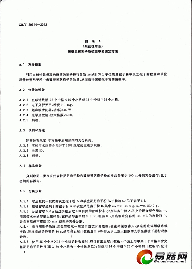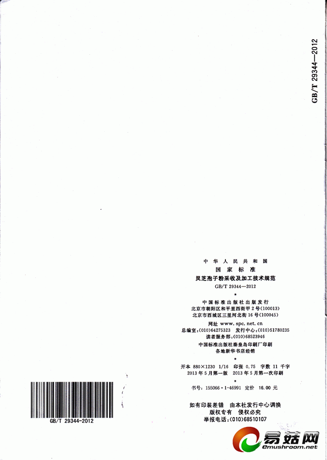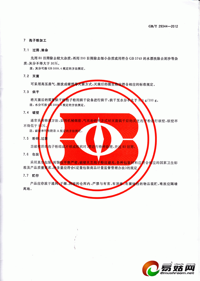 第一个国家标准《灵芝孢子粉采收及加工技术规范》国家标准[GB/T 29344-2012] ,英文标准名称 Standards on harvesting and processing techniques of ganoderma lucidum spore powder。