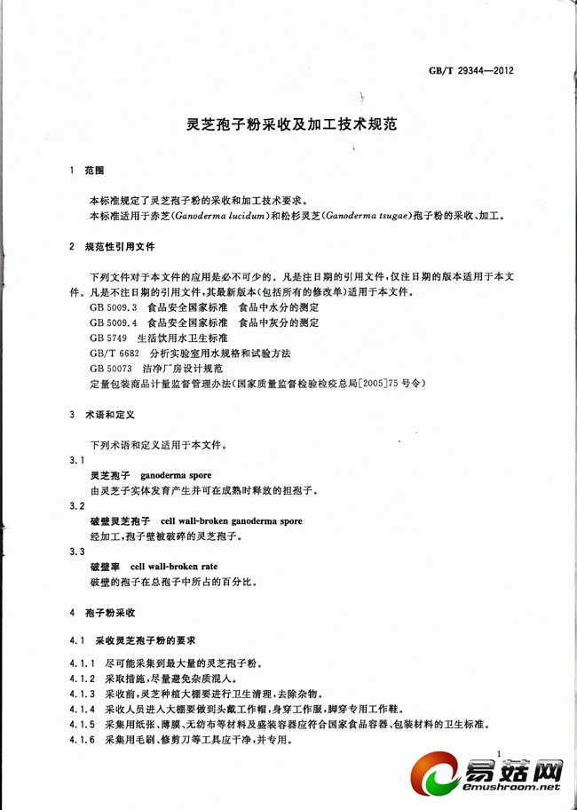 《灵芝孢子粉采收及加工技术规范》国家标准文献内容: