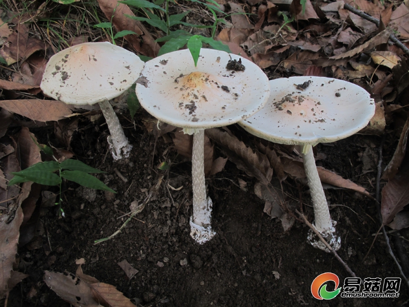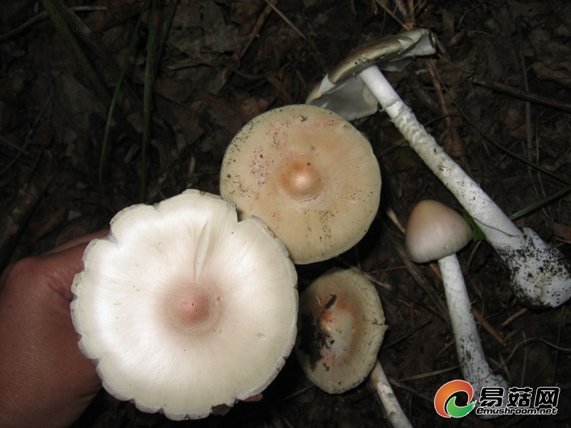 菌盖中等大小,白 色,有时中央淡粉红色,边缘无沟纹, 但有时有辐射状裂纹。菌褶白色;短菌 褶近菌柄端渐变窄。菌柄白色、污白色 至淡黄褐色,基部近球状。菌环近顶 生,膜质,白色。菌托浅杯状,白色。 担子体遇5% KOH 快速变黄色。担孢子 6~8×6~7.5 μm。生境:夏秋季生于各种针阔混交 林中地上,有时生于阔叶林中地上。