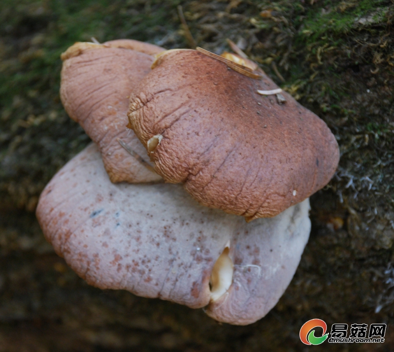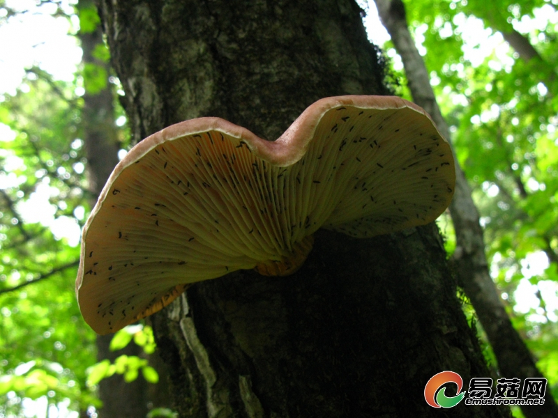 菌盖宽 6~23cm。初期圆球形,后平展呈扇形、肾形或半圆形,菌盖边缘微下卷,表面橙黄色、肉桂色,近中央处有鳞片散生,中央暗紫色,组成不规则的斑纹,有棉絮状鳞片相间,有裂纹。菌肉淡黄色,新鲜子实体有令人不悦的气味。菌褶达2 cm,脆,纤维质,切开后基部有黑点,弯曲,近柄处下延。菌柄侧生,长1.5~2 cm,直径2.5~4 cm。担孢子直径13~18 μm,球形,光滑,无色。
