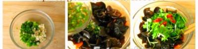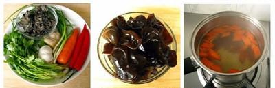 2、锅中放清水烧开后,入黑木耳汆烫3分钟捞出,用冷开水洗去表面粘液;