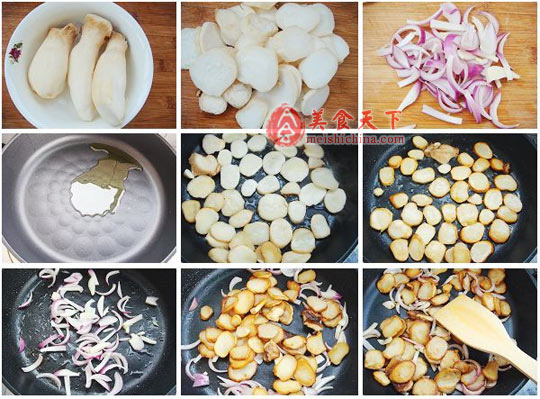 原料:杏鲍菇、洋葱、生抽、盐、胡椒粉、橄榄油