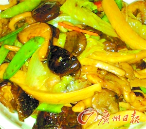 做法:生菜、冬菇、金针菇和平菇洗净备用;白灵菇和鸡腿菇洗净,切条状备用;兰豆去筋洗净,和粉丝一起飞水备用;开锅下油,将各种菇菌煎香,取出;然后以拍蒜爆香菇菌,下鸡汤和蚝油、兰豆、粉丝、生菜,中火煮开后收汁调味即成。