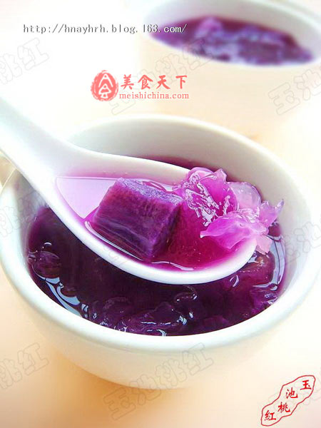 周天去菜市场买菜时看到有紫薯,价格上虽然比原来涨了好多,但比前些时间卖的要大很多,非常喜欢紫薯那迷人的颜色,就买了一些。今天煮银耳汤的时候,加进去了两个紫薯,煮出来的汤很惊艳,梦幻的紫……味道很好。看来紫薯和银耳也是很搭的。