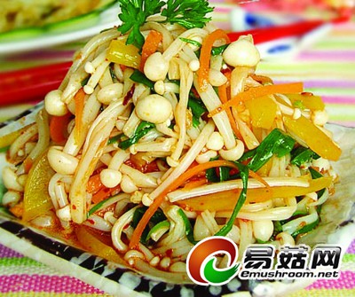 制作方法:将水烧开,先放入金针菇、黄甜椒丝烫三十秒,最后加入葱段拌匀,捞出后,放入冰水里浸泡半分钟;一勺半生抽、一勺香醋、小半勺蜂蜜和蒜蓉充分拌匀,放入金针菇、黄甜椒丝拌匀,上桌前滴几滴香油即可。由于金针菇非常细嫩,在水里烫的时间最好不要超过三十秒,否则口感不好;烫好的金针菇要轻轻地挤干水分,以免上桌后菜品溢出太多水分,影响味道和美感;最好随吃随拌,放置久了,金针菇会吸收酱料的颜色,颜色就不太好看了;如果不喜欢蒜蓉的味道,可以将少许香油烧热浇入蒜蓉上,这样蒜蓉就不会太刺激,而且也不会辣了;喜欢吃辣的话可以加少许的辣油,味道自然更胜一筹。