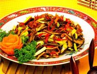 3.炒锅上火,下少许茶油,下干椒、花椒炒香后再加入鳝段,加入香菇在锅中炒香,最后加入其他调料即可出锅。