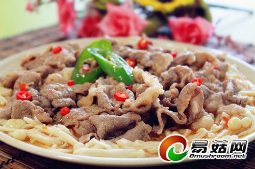 7. 最后,将煮好的肥牛片倒在金针菇上,就完成了!