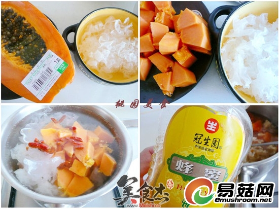 3、将上述食材一同放入汤煲内,一次性加足水,大火烧开打去浮末,关中小火炖40分钟后,稍凉,调入蜂蜜即可。