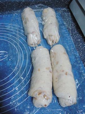 6.将面团擀开成椭圆形,自上而下卷成一个圆柱形,盖上保鲜膜,放10分钟。