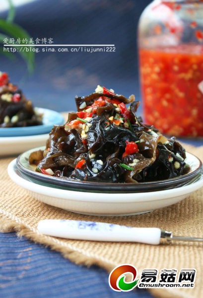 用料:水发黑木耳150克,生抽1小匙,醋1大匙,白糖0.5小匙,剁椒2大匙,盐适量,鸡精少许,芝麻油0.3小匙,油2大匙,大蒜3瓣,葱适量,花椒十余颗;