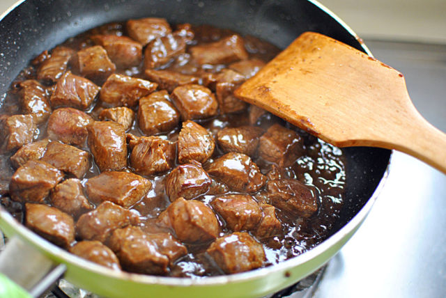 7. 连同汤汁一起将牛肉粒倒入锅里,和杏鲍菇一起翻炒至上色;