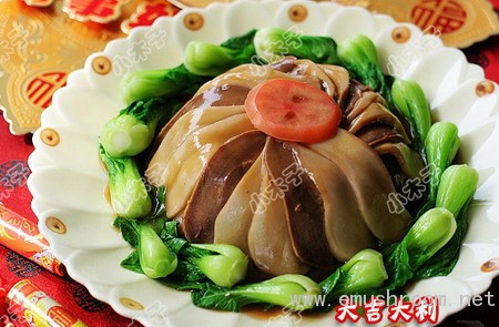 4、用一个比碗大的碟子盖住整个碗,把碗反扣过来,把蒸出来的汁水倒出来留着备用,取掉碗,半成品就是一个比较好看的圆形了,然后烫几条青菜做围边,另外用刚才留出的汁水+蚝油+盐+糖+生粉+水做一个比较稠的芡汁淋在成品上即可。