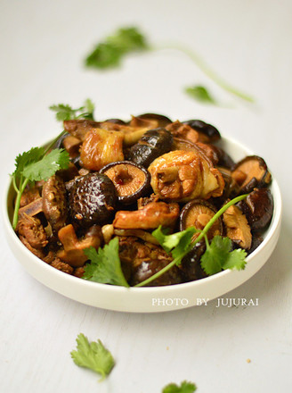 5.放入香菇同炒,兑入清水,没过鸡肉即可,大火煮开,小火焖煮20分钟