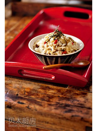 5 启动煮饭功能,待饭煲煮好后,打开盖子,用饭勺搅拌均匀,撒上海苔丝即可。