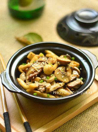 3.切好的菌菇们放入煸炒一会;调入少量食盐