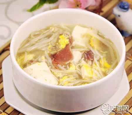 5、锅中注入水,加入豆腐和火腿片,烧开。