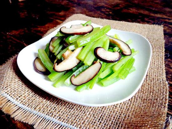 2、锅烧热,倒入少许植物油,放一点姜末煸香后,把芹菜和香菇一起放入,快速的翻炒