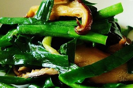 8.将焅好的香菇与过水后的韭菜拌在一起,装盘即成。