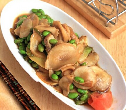 【核心提示】: 1.将杏鲍菇切片,准备葱姜蒜末 2.热锅加油,加入葱姜蒜炒香 3.先加入毛豆,炒出豆香后加入耗油,炒匀 4.加杏鲍菇,