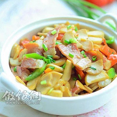 5、 放入培根,炒出油,再加入杏鲍菇翻炒