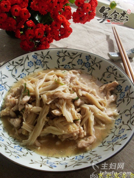 1、猪肉洗净切丝;金针菇去根,洗净,切段