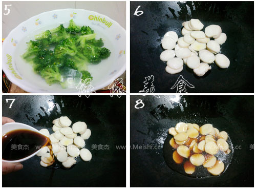 10、夹起杏鲍菇片排在西兰花里面,焖杏鲍菇的酱汁留在锅中