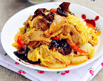 材料:猪瘦肉100克,大白菜3片,细木耳10克(用温水泡发),新鲜红椒1个,姜蓉1小匙,大蒜3瓣