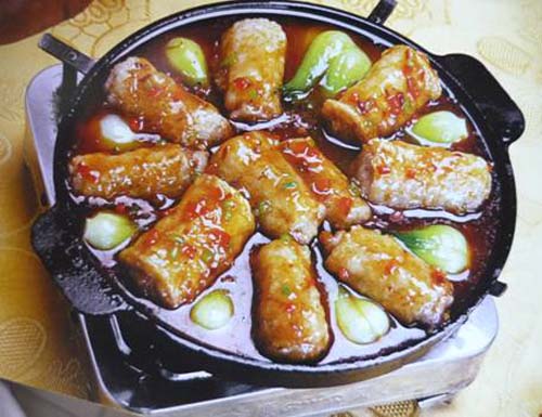 3. 炒锅上火,加清油烧至4成熟把竹荪抹上脆炸粉入锅炸熟捞出。菜胆清炒后和竹荪卷一起放在铁板上,加青红椒粒、香菜粒和XO酱一起炒香后加水、调料、勾芡,最后把汁淋在竹荪卷上,烧烫铁板即可上桌。