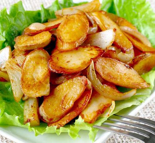3、炒锅里加入一勺油,小火将杏鲍菇片两面都煸成微黄色盛出;