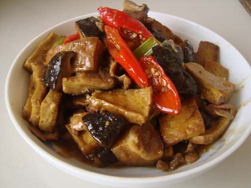 材料:豆腐300克,瘦猪肉50克,香菇8朵,红辣椒2个,葱、姜、蒜,盐,老抽、花椒粉、白糖、味精、植物油