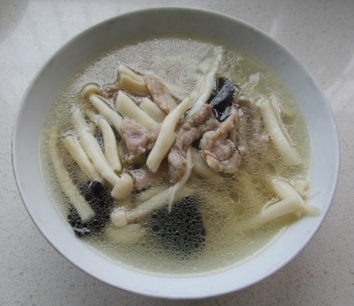 材料:海鲜菇100克,肉丝100克,木耳少许,油、葱姜、盐、料酒、鸡精适量。