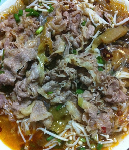 材料:肥牛,金针菇,粉丝,酸菜,花椒,干辣椒