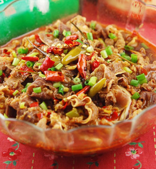 材料:肥牛片3两,金针菇适量,粉丝一小把,葱,干辣椒3颗,玉米油适量,葱花蒜米姜米少许,清水适量,李锦记双茶老抽1勺,李锦记蒜蓉辣椒酱1勺,泡椒10颗,泡椒水少许,盐,料酒,白醋