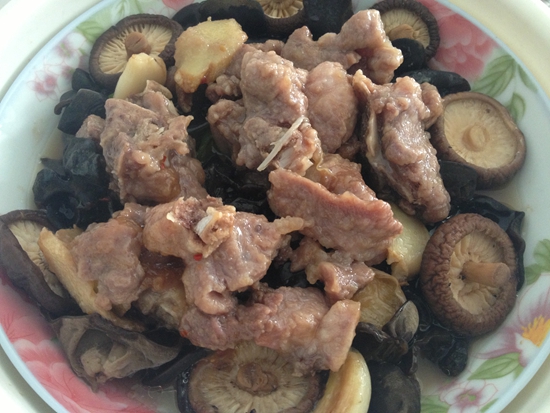 材料:材料:排骨250g、香菇10朵、木耳半把/佐料:调和油、酱油、盐半勺、生姜3片、蒜头2瓣、淀粉3勺(调味勺)、青椒1根