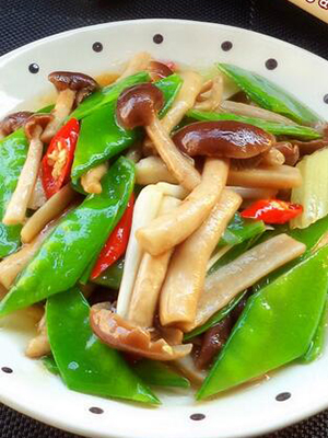 材料:荷兰豆150克 茶树菇200克 香芹20克 小红椒3根 姜蒜15克 油适量 盐0.5茶匙 糖0.5茶匙 生抽1茶匙 蚝油1茶匙 生粉1茶匙