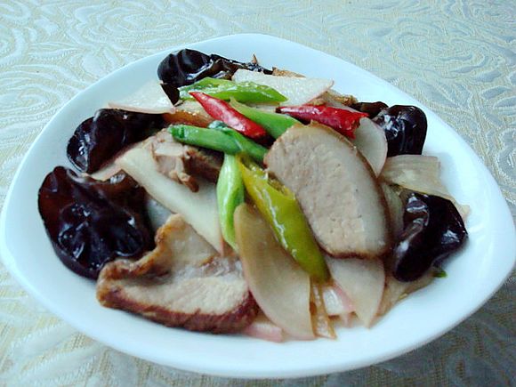 材料:卤五花肉250g、红萝卜一个、蒜苗3根、盐适量、鸡精小勺、姜3片、味极鲜适量、杭椒3个、水发黑木耳5g