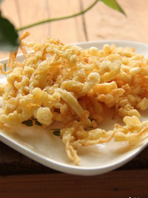 4、大火烧热油至7成热,取少许金针菇放入蛋糊中,使金针菇表面均匀地裹上蛋糊,放入油中炸至呈淡金黄色,捞出沥干油分;