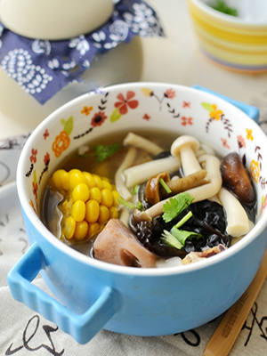 材料:排骨适量、墨鱼干适量玉米、什锦菌菇 (包括黑木耳,香菇,花菇,滑菇等等)、姜2片、香叶1-2片 、莲藕、盐