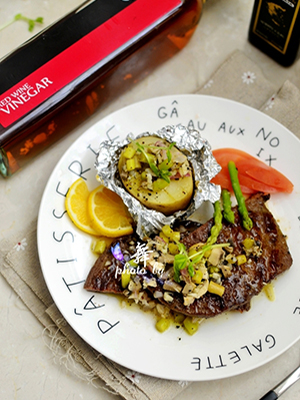 材料:香草牛排一块、小土豆一个、芦笋3根、蘑菇2粒、紫洋葱一粒、蒜瓣一个、现磨黑胡椒颗粒一勺、盐少许、红葡萄酒醋少许、橄榄油一大勺、柠檬汁10克