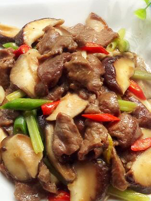材料: 鲜冬菇200克、牛肉150克、青红椒30克、香芹20克、香蒜1根、蒜子10克、油适量、盐1.5茶匙、糖1茶匙、生抽1茶匙、蚝油1茶匙、胡椒粉少许、生粉1茶匙、芝麻油少许