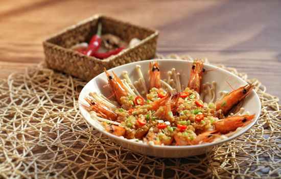 5、碟内先铺金针菇,再摆放好开背虾。把烧好的调味料浇盖在虾的开背处,汤汁淋在金针菇上