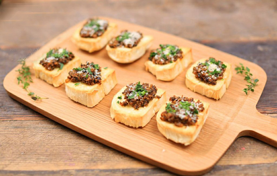 8、将炒好的香菇放在烤好馒头片上,再撒上干酪
