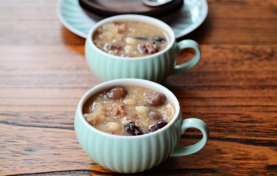 材料:大米 20克、银耳20克、糯米20克、荞麦20克、小米20克、桂圆20克、绿豆20克、核桃20克、红枣20克、红米20克、冰糖30克、杏仁15克