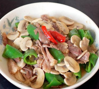 【核心提示】:材料:猪里脊肉300克、口蘑200克、葱适量、尖椒1个、红尖椒1个、食盐适量、酱油少许、味精适量、淀粉少许、白糖少许