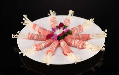 原料:肥牛片、金针菇、芥兰、青红辣椒、蒜肉、黄瓜、胡萝卜、蚝油 、绍酒、酱油、水、淀粉、白胡椒粉、冰糖。